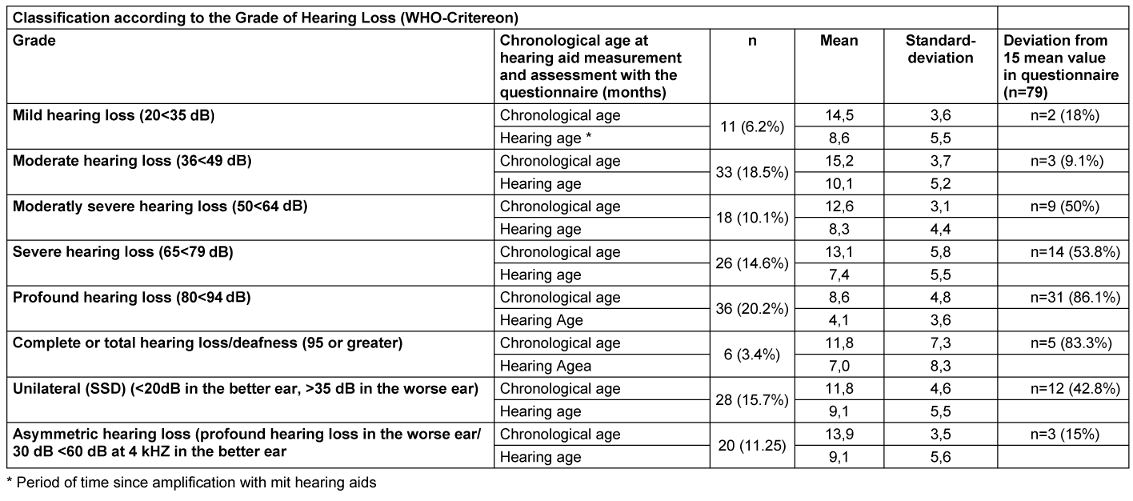 The severity of the group and the hearing loss are distributed as follows: mild hearing loss (20<34 dB/WHO 1) 11 children (6.2%), moderate hearing loss (35–49 dB/WHO 2) 33 children (18.5%), moderately severe hearing loss (50<64 dB/WHO 3) 18 children (10.1%), severe hearing loss (65<79 dB/WHO 4) 26 children (14.6%), profound hearing loss (80<94 dB/WHO 5) 36 children (20.2%), deafness (95 and greater/WHO 6) 6 children (3.4%), unilaterally deaf (SSD) 28 children (15.7%), and asymmetrical hard loss (AHL) 20 children (11.2%). 15 subjects were fitted with a bone conduction hearing aid unilaterally or bilaterally.