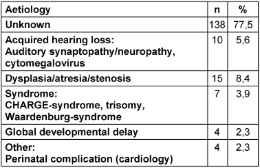 Isolated hearing loss was present in 77.5% (n=138), acquired hearing loss for example auditory synaptopathy/neuropathy (AS/AN) or cytomegalo virus in 5.6% (n=10), conductive hearing loss in 8.4% (n=15), and syndromal hearing loss in 2.3% (n=4).