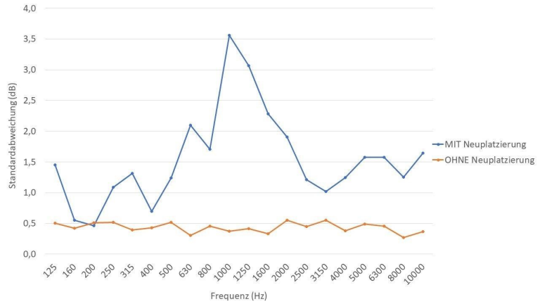 Abbildung 1: Standardabweichung der REAR pro Frequenz bei fünf Insitu-Messungen mit und ohne Neuplatzierung des Insitu-Schlauchs zwischen den Messungen