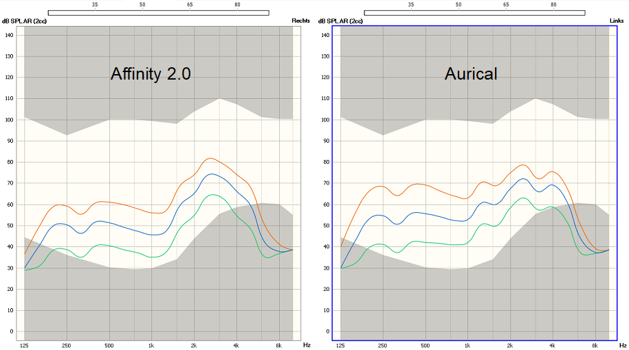 Abbildung 2: Vergleich eines Hörsystems mit AutoREM an der Affinity (links) und der Aurical (rechts) angepasst. Die abschließende Vergleichsmessung fand an der Aurical statt, um vergleichbare Messergebnisse zu erzielen.