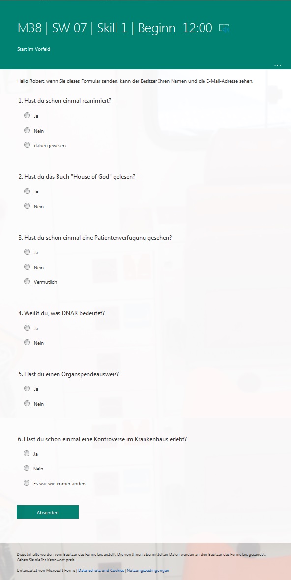 Am Ende führten wir eine weitere Umfrage bei Forms durch, in der wir sie nach ihrer Meinung zum Seminar und zum parallel stattfindenden Notfallmedizin-Kurs fragten (siehe Anhang 2 [Anh. 2]).
