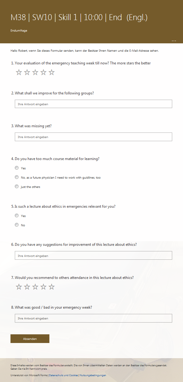 Starting December 2019 in China the novel corona virus SARS-CoV-2 has spread around the world infecting millions and killing thousands [1], [2], [3]. It reached Berlin at the beginning of March [4], and was followed by the prohibition of group aggregations until only household members were allowed to undercut minimal social distance [5]. The beginning of the semester was postponed for all students including medical students at Charité Universitätsmedizin Berlin [6]. Ethics and ethical decision making in emergency situations had been taught with simulation patients or relatives and small group discussions embedded in the emergency medicine course in the tenth semester. We now had to find a different format. First attempts at online ethics teaching have shown non-inferiority in an ethics course combined of lectures and tutorials [7] and a positive effect on student confidence in decision making using an online platform [8].