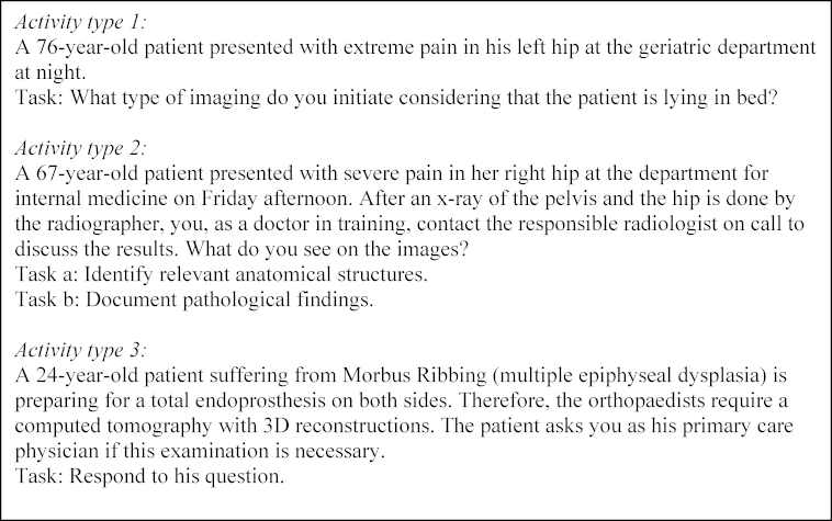 Defining three types of clinical activities helped in guiding the development of VPs requiring CDS skills related to radiology, which have previously been proposed for medical undergraduates [7]. The VP-based quizzes and webinars showed high acceptance among the students and can be improved based on the provided comments.